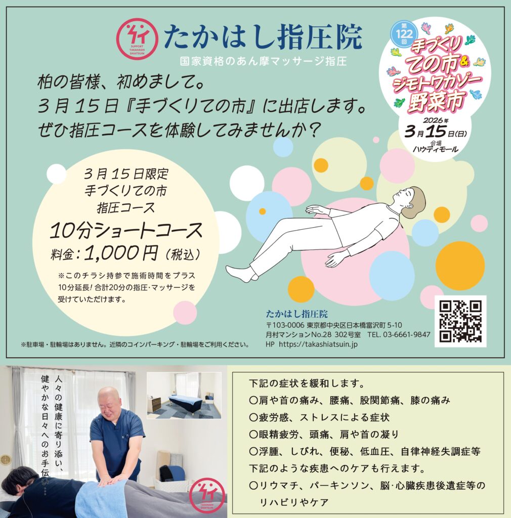 柏市の駅前で3/15日にフリーマーケットがあり、たかはし指圧院が出店してきます。